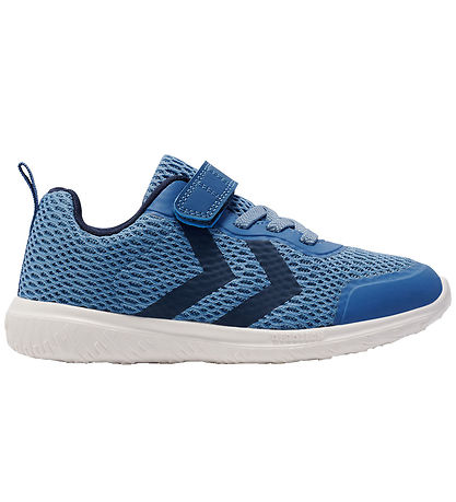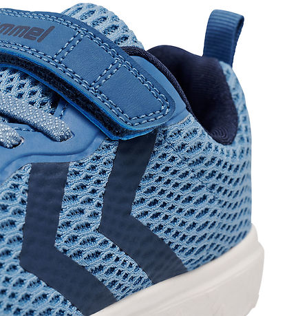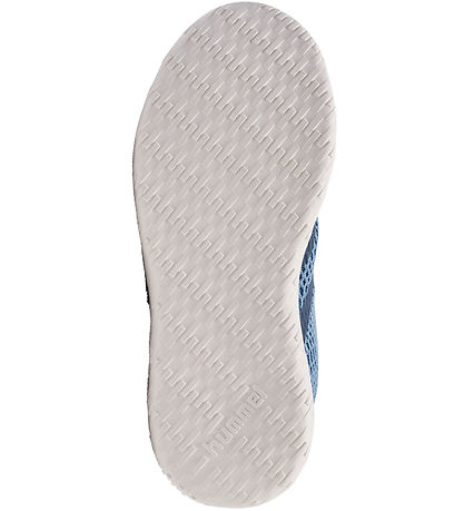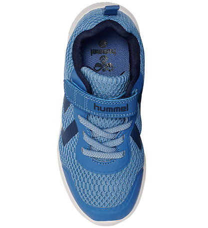 Stylish Hummel shoes in blue mesh with dark blue logos on the sides and white outsoles.