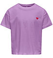 Beautiful Kids Only t-shirt in bordeaux with a heart embroidered in pink on the left chest. The T-shirt has a round neckline with a narrow ribbed edge and short sleeves.