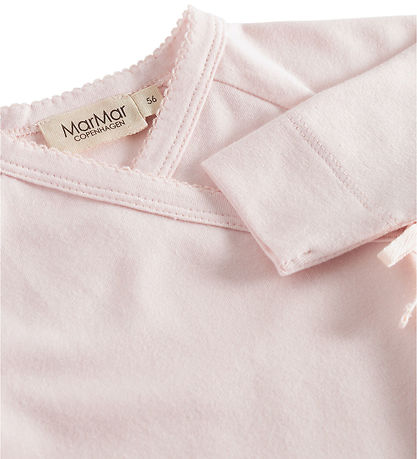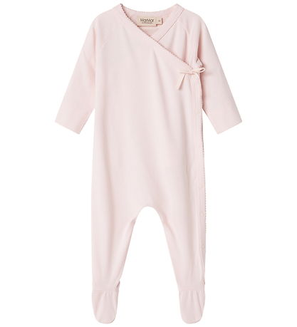 The Jumpsuit has long sleeves and legs with fixed feet. The MarMar jumpsuit closes with practical push buttons and a nice bow detail on the front. The jumpsuit's asymmetrical closure adds a special touch to the simple design.