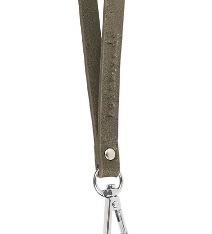 Beautiful Rosemunde keychain in dark olive green imitation leather with a silver pendant and "Rosemunde" embossed into the material on the side.