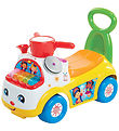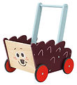 The Smoby baby walker has four wheels, and the kid can sit on the stroller and push himself forward. There is a robust handle at the top. The pony pulls a little cart behind it, which can be unhooked.
