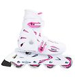 Cool Supreme rollerskates in light blue with white shoelaces and pink details. On the tongue and outside there is "SR" in white writing.
