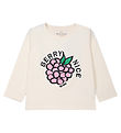 Sweet The New Siblings blouse in cream with a print of a raspberry in pink and green. Around the raspberry is the text "Berry Nice" embroidered in black.