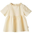 The Wheat dress has short sleeves and a round neckline with a narrow ribbed hem. It is opens with practical push buttons on the left shoulder, and at the waist there is an elastic seam, which gives the skirt a good width and nice folds. The Dress is in a soft and stretchy quality.