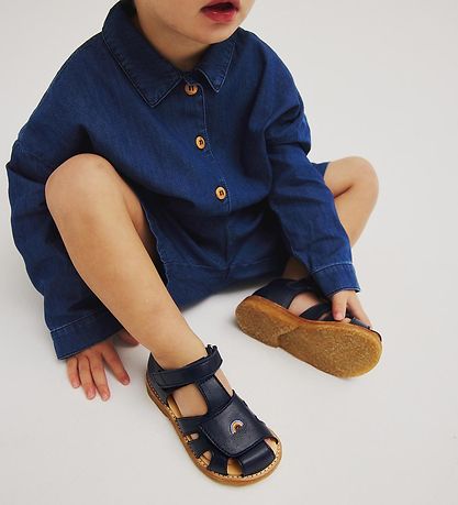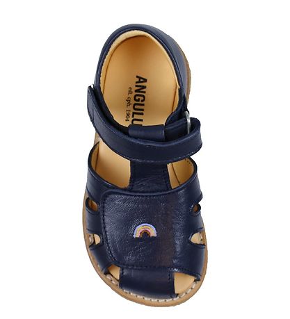 Cute Angulus prewalker sandals in shiny navy with an embroidered rainbow at the toes.