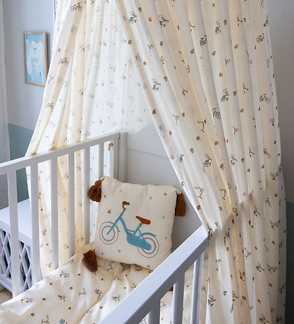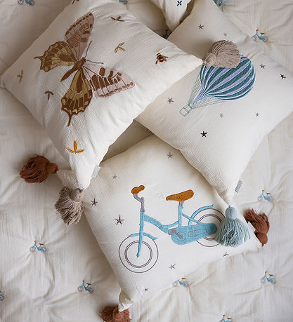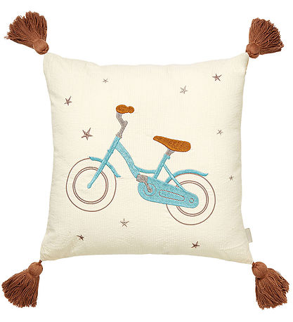 Beautiful Cam Cam Copenhagen cushion in cream white with a fine structure in the fabric and an embroidered bicycle and stars on the front. In all corners there are cute tassels.