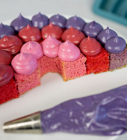 Smart Dëna baking pan in dark pink and shaped like a rainbow.