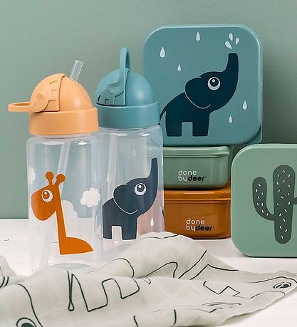 The Done By Deer water bottle has a lid with a handle. When you push the handle back, a straws appears and when the lid is closed, the liquid can not flow out. The straw is made of soft silicone.