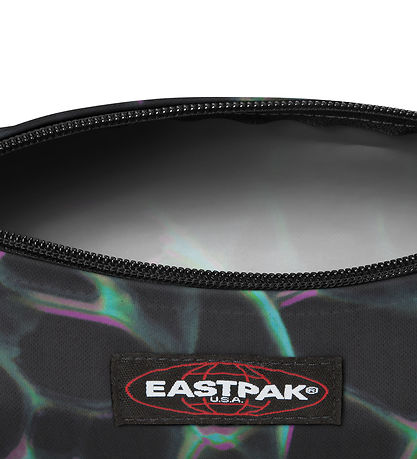 Smart Eastpak pencil case in black with a flowing pattern in green and purple shades. On the side there is a logo patch in the brand's original colours; red, white and black.