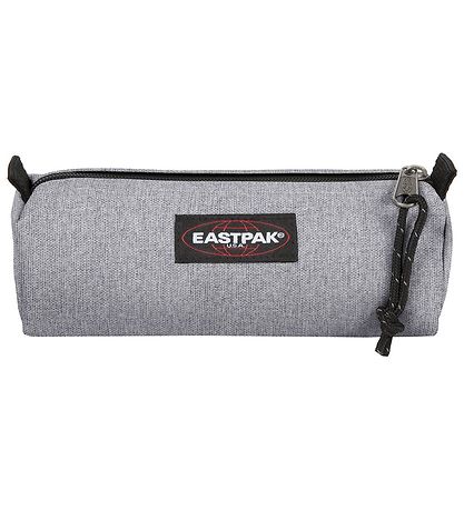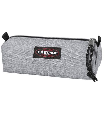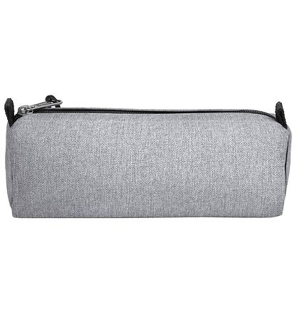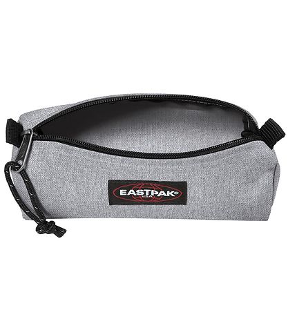 The Eastpak pencil case is elongated and has a round shape with a flat bottom. The pencil case opens at the top with a zipper.
