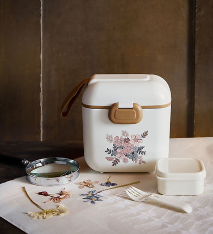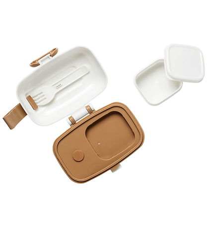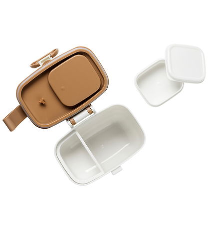 The Elodie Details snack box opens at the top with a lid that is kept locked with a smart buckle. On the inside of the lid there is a practical fork. The snack box Rum is closed by an insert tray with rubber seal, in which there is a built-in space for a little, square box with lid.