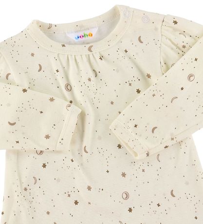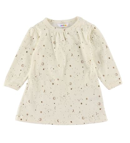 Beautiful Joha dress in white, with a print of stars, moons and more in shades of brown all over.