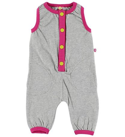 The jumpsuit from Katvig is light grey with pink edges and lime green buttons