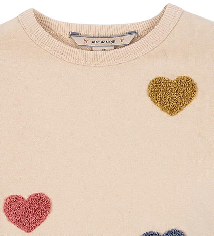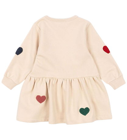 Beautiful Konges Sløjd dress in a light, beige shade with embroidered hearts in different colours. The Dress has long sleeves and a round neckline. The skirt has fine pleats that give a light and airy look.