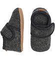 Stylish Melton slippers in grey melange wool with a brown suede Velcro closure.