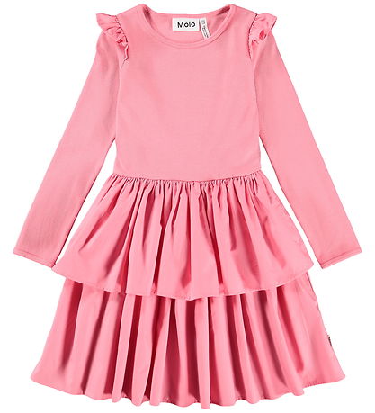 Elegant Molo dress in pink with orange highlights. The Dress has a ribbed structure at the top. It has a round neckline and long sleeves with ruffles at the shoulders. It is cut at the waist, and the skirt consists of two layers of different lengths.