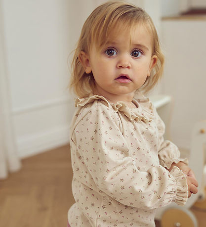Elegant Müsli blouse with a fine pattern of small flowers in muted shades and a fine ribbed structure. The Blouse has long sleeves and decorative ruffles at the neckline, which add a nice touch. The Blouse has a narrow elastic edge in the neck opening, so it can be pulled down over the head. The Müsli blouse presents a simple but stylish design that gives a discreet expression.