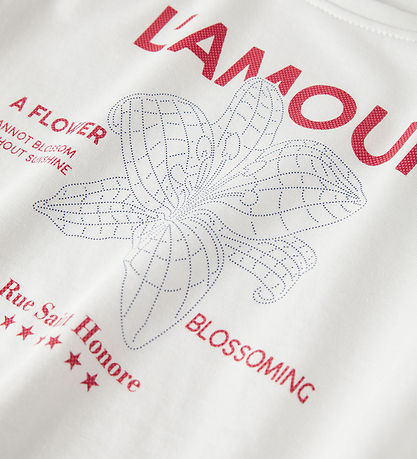 Elegant Name It blouse in white with a beautiful print on the front with the text "L' AMOUR" in red and a flower in blue dots. The French element "Rue Saint Honore" adds extra charm to the design.