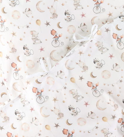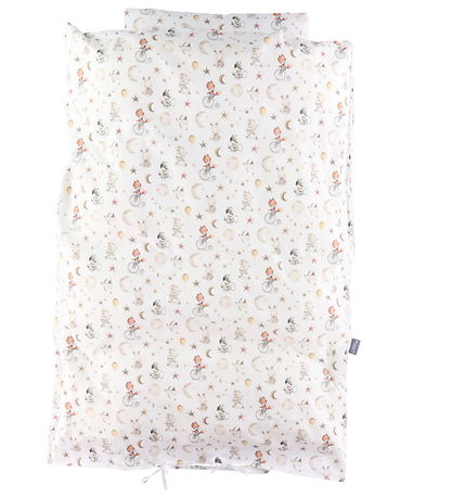 Fine Nørgaard Madsens bedding in white with an allover print of cute DYR with toys as well as moons and stars, all in muted colours.