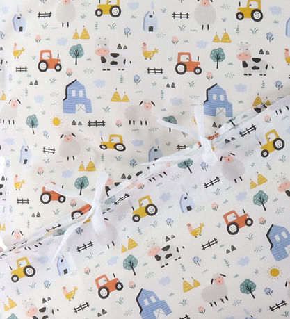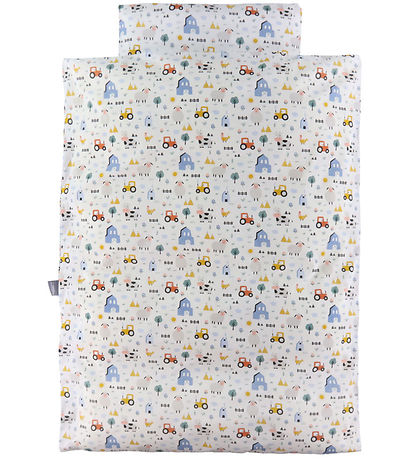 Smart Nørgaard Madsens bedding in white with a colorful allover print of many fine motifs, including farm animals, tractors and trees.