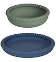 Practical OYOY plate and bowl, both with a round shape in green and dark blue.