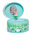 The Petit Monkey jewelry box comes in a square shape. Inside the jewelry box there is a music box, which is wind up on the back. When it wind up and the lid is opened, a small grey rabbit on a pink flower appears, which spins around, while the jewelry box plays "Blue Bird of Happiness".