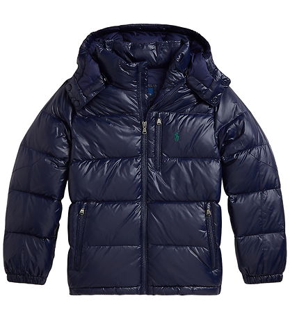 Nice Polo Ralph Lauren down jacket in plain navy with a little, green logo embroidered on the left side.