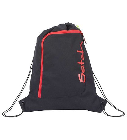 Smart Satch gymsack in black with a red zipper, and down along one side is says "Satch" in large, red letters.