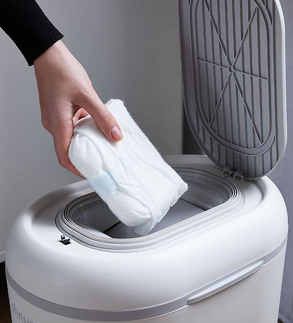 The Shnuggle diaper pail is easily opens and closed with one hand by pressing one end of the lid at the top, and the used diapers slide by themselves into the double-sealed bucket, where the smell is encapsulated. The nappy bin can hold up to 26 nappies