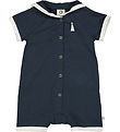 The Stella McCartney Kids summer romper has short sleeves and legs. It opens at the left shoulder with two pushbuttons, and between the legs, there are also push buttons.