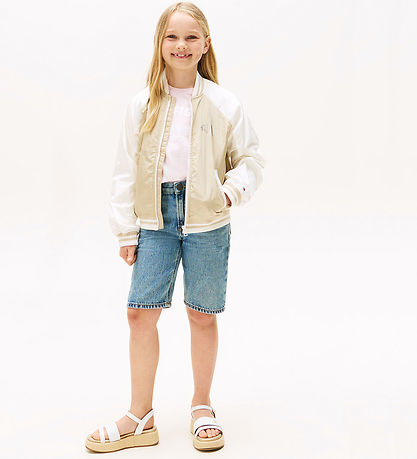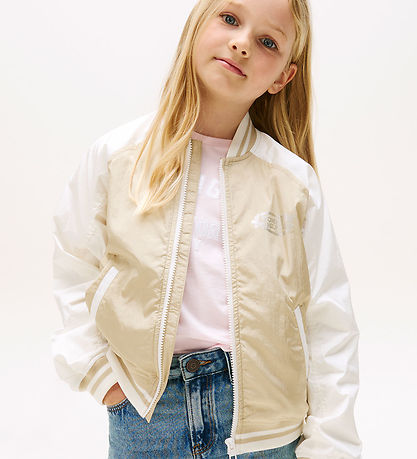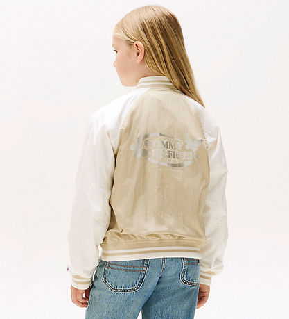 Stylish Tommy Hilfiger lightweight jacket with a beige body and contrasting white sleeves. On the front left chest there is a Tommy Hilfiger logo with butterflies in silver, with a large matching logo on the back of the jacket.