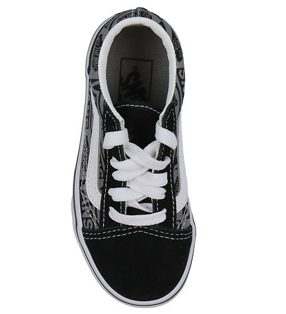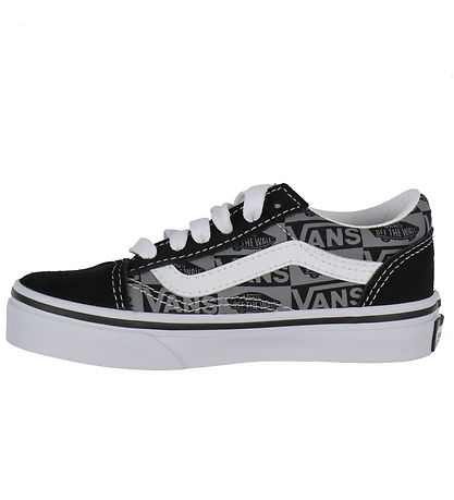 Smart Vans shoe in black and grey with an all-over logo print, as well as white leather stripes on both sides and white stitching. On the heel there is a white Vans brand and on the toes there is black suede.