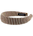 Lovely By Stær scrunchie in navy blue satin with a nice, ribbed pattern in the structure and an edge in white and gold thread.