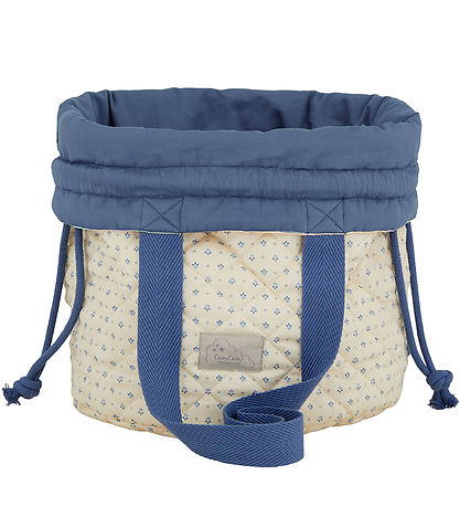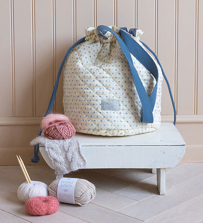 Smart Cam Cam Copenhagen project bag in beige with an allover print of fine, small flowers in shades of blue. The project bag has a quilted structure and it has blue straps and lining.