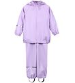 The rainwear has narrow reflective stripes around the right sleeve and right trouser legs, and at the top of the left sleeve and on the hood, there is a reflective print.