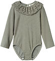 The Filibabba swimsuit has long sleeves and a round throat with a nice edge. It opens with a zipper down the chest, and the zipper has an inner placket and chin guard. In the leg openings, the swimsuit has narrow elastic edges and cute ruffles.
