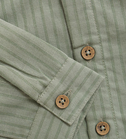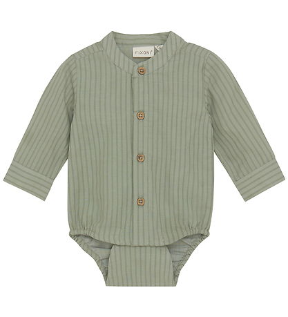 Beautiful Fixoni shirt bodysuit in green with narrow stripes in a darker green shade. The Bodysuit has a round neckline with a mandarin collar and fine buttons at the front and in the sleeve openings. It has long sleeves and closes with push buttons between the legs.