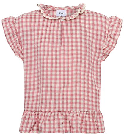 Charming Grunt top with a check pattern in pink and white. The top has an elegant collar with a narrow lace edge and short sleeves with ruffle edges. At the bottom, the Grunt top has a fine ruffle edge, which gives a stylish finish. The top closes at the front with a little button, and it is made of a light, tightly woven quality.