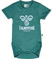 Beautiful Hummel bodysuit in green with an all-over-print of letters and the Hummel bee printed in white at the front.