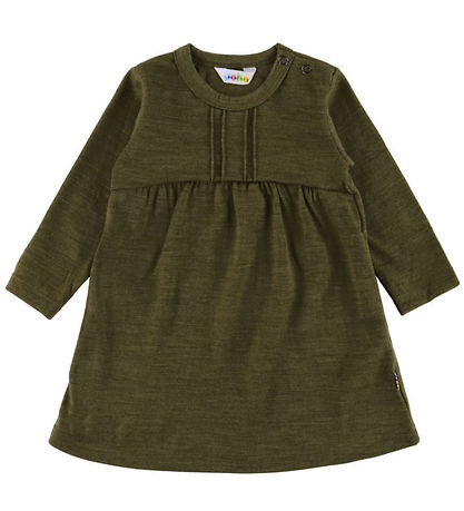 Elegant Joha dress in a deep olive green shade. The dress's design features fine pleat details at the chest area, adding a discreet touch to the simple style. The Joha dress has long sleeves and a practical closure at the shoulder with two buttons.