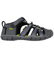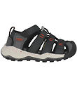 Practical KEEN sandals in black and dark grey with orange details and reflective details.