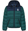 Nice LEGO® Wear puffer jacket in dark green and navy blue with horizontal stitching.