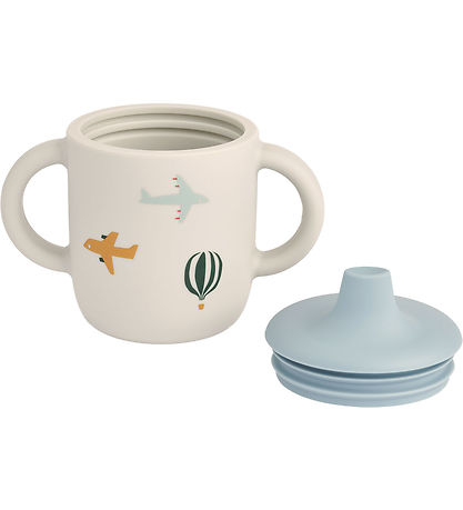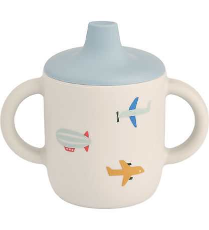 Cool Liewood cup in cream white with a colorful print of aircraft. The cup's lid with spout lid is in light blue.