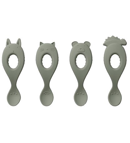 Smart Liewood baby spoons in green, sold in a 4-Pack with cute details of the classic Liewood DYR; The panda, the rabbit, the cat and the dinosaur.