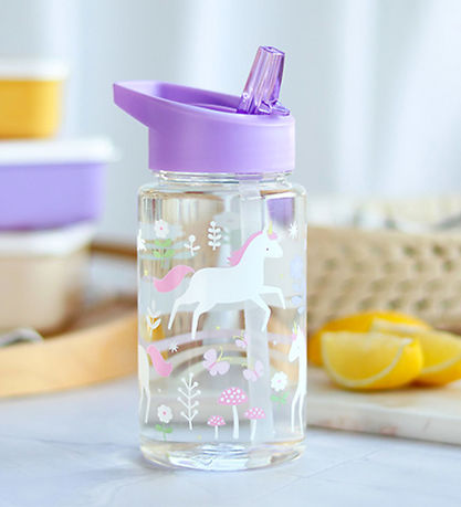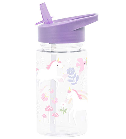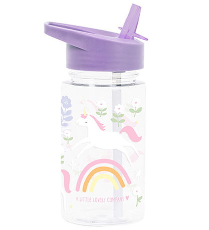 Beautiful A Little Lovely Company water bottle in transparent plastic with a unicorn print. The lid is in purple.
