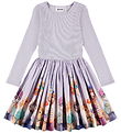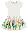 The upper set of the Molo dress has a ribbed structure and is made in a stretchable quality. At the top there is a narrow elastic with a wide ruffle edge, which goes over the left shoulder. At the waist there is a good elastic edge, which gives the skirt lovely folds. The skirt is made in a tightly woven cotton quality.