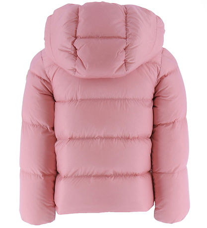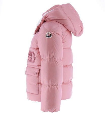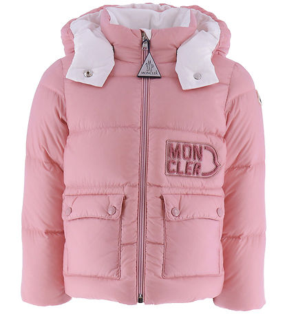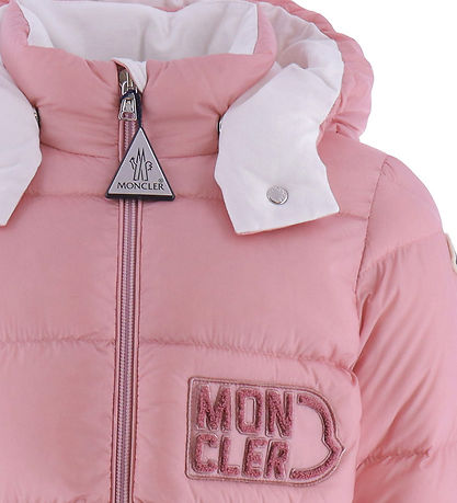 Cute Moncler down jacket in plain pink in a smooth woven quality, and on the front on the left side it says "Moncler" in terry cloth letters in dark pink.