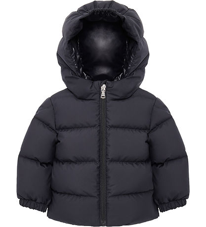 Nice Moncler down jacket in plain navy, and at the top of the left sleeve there is a felt brand with a Moncler logo.