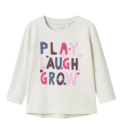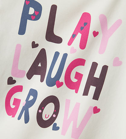 Cute Name It blouse in off white with a nice print on the front, where the text "Play Laugh Grow" is highlighted in different colours and decorated with small hearts.