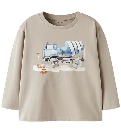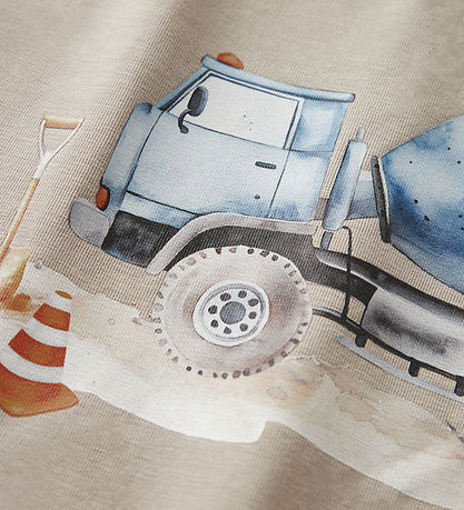 Beautiful Name It blouse in a neutral beige colour. The Blouse has a print on the front of a cement truck in blue and white shades, standing on a sandy surface, accompanied by an orange shovel and cone.